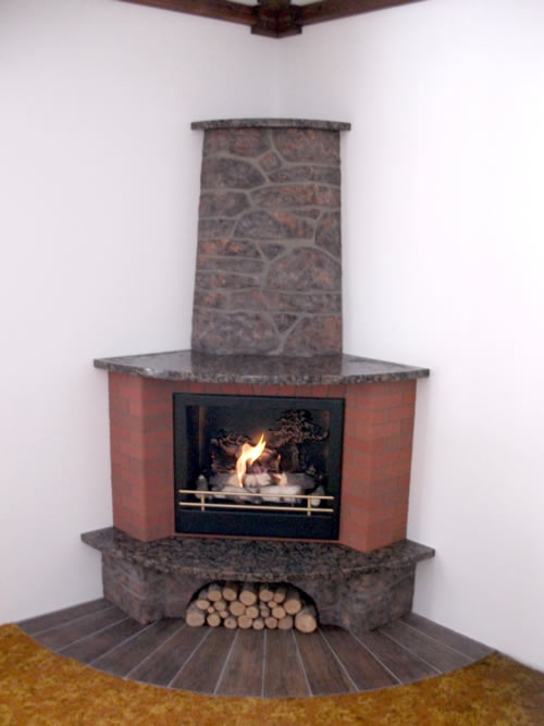 Biokamin als Eckkamin, Natursteinplatten mit Haube und Sockelteil in Natursteinoptik, Mittelteil Ziegeloptik mit Blende und Kaminbild