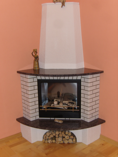 Biokamin als Eckkamin, Mittelteil weiß in Ziegeloptik, hochwertige Steinplatten, Haube und Sockel in weiß, Messingblende Brenntechnik komplett mit Spiegel, regelbar, Blende